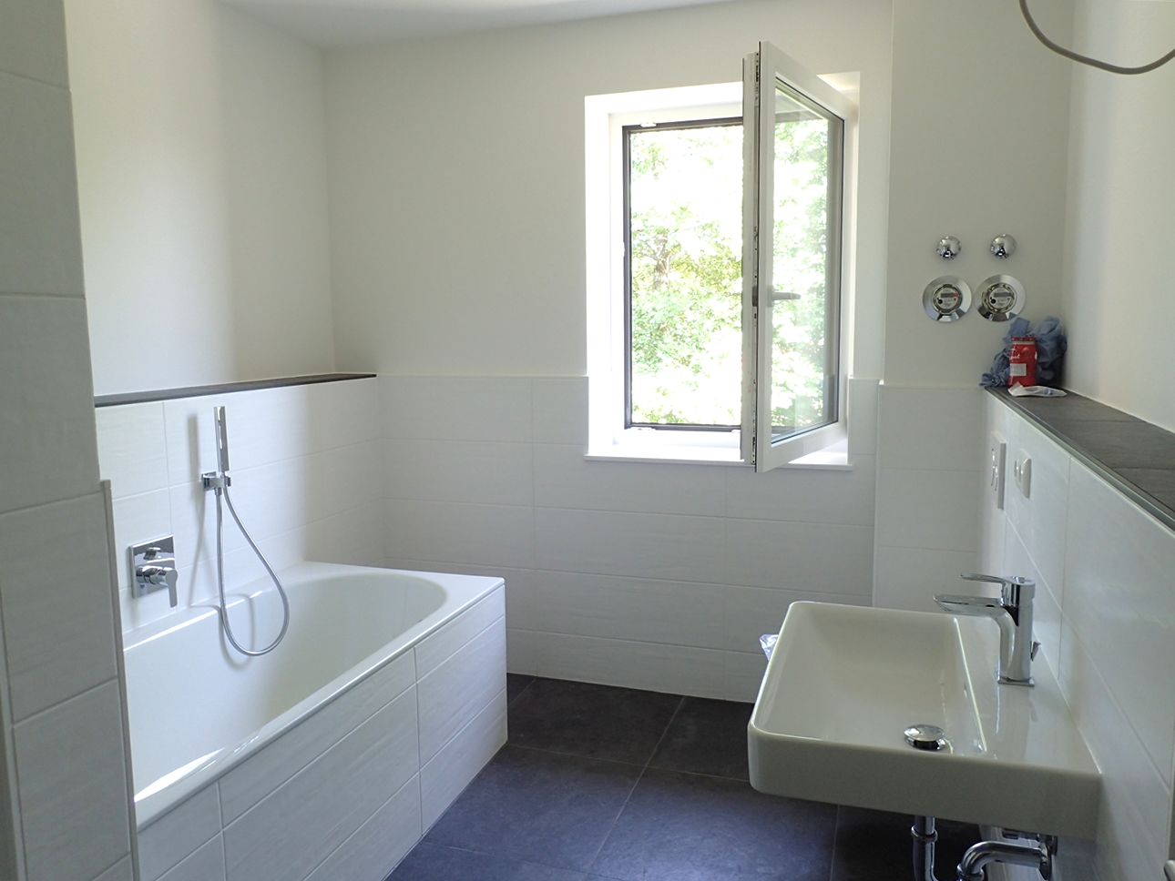 Die im Obergeschoss befindliche Küche verfügt bereits über eine Einbauküche mit Kühlgefrierkombination Herd/Ofen und Spülmaschine der Marke Siemens. Die Bäder sind stilvoll gefliest und verfügen über eine hochwertige Sanitärausstattung.