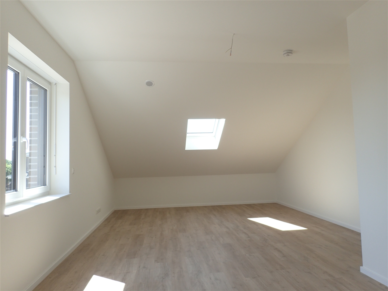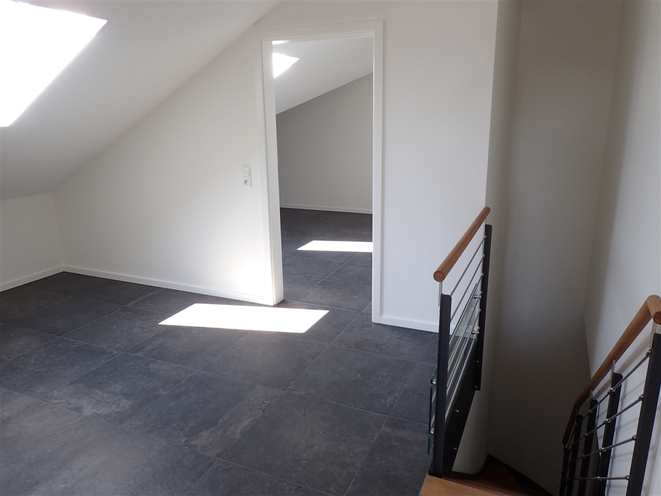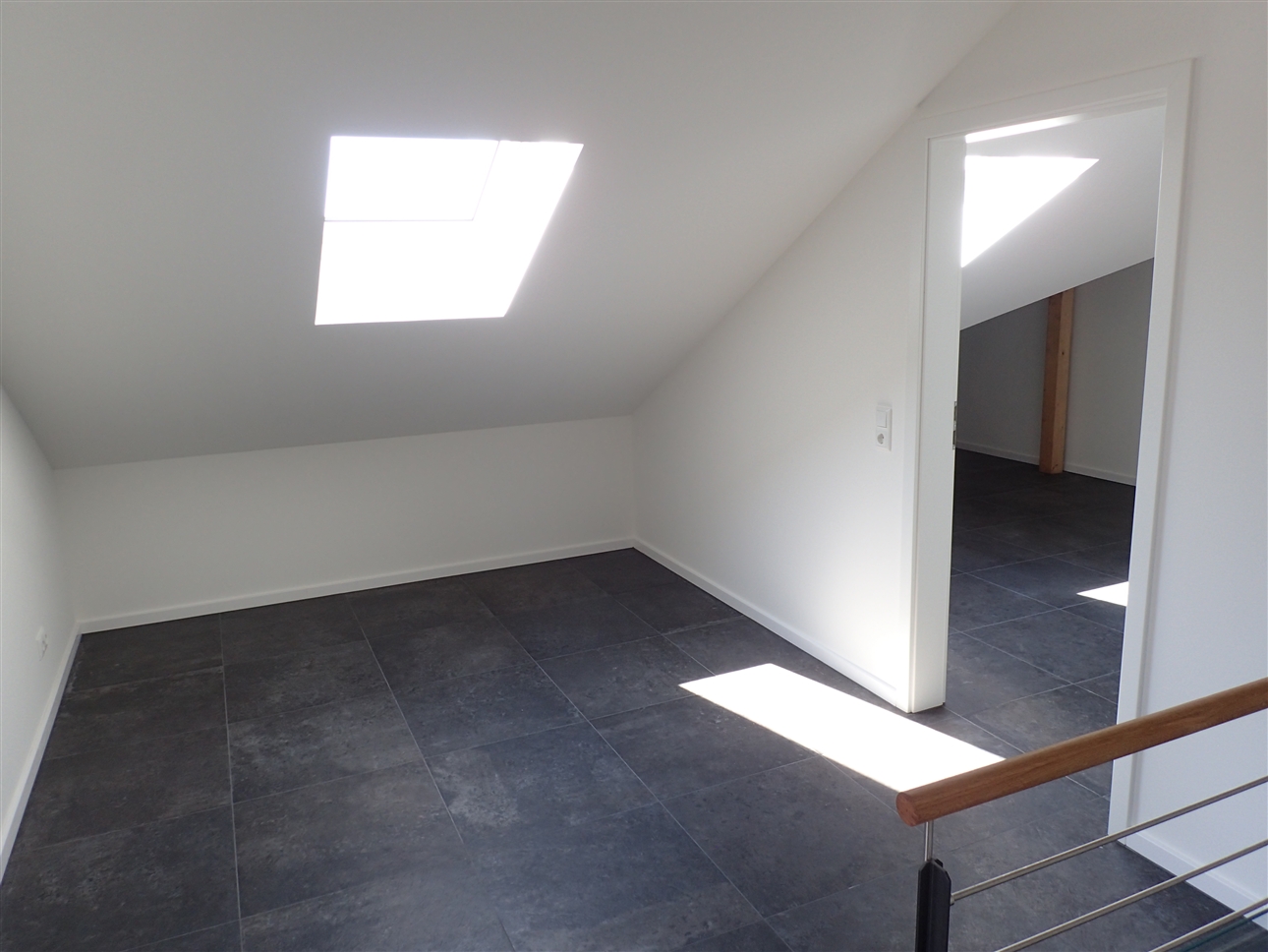 Der über eine moderne Treppe aus dem Flur erreichbare Dachgeschossbereich umfasst ein sehr geräumiges Zimmer mit Dachschrägen, einen gut nutzbaren Korridor sowie ein extra Badezimmer