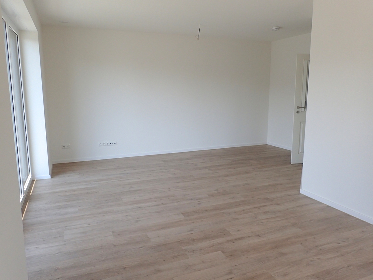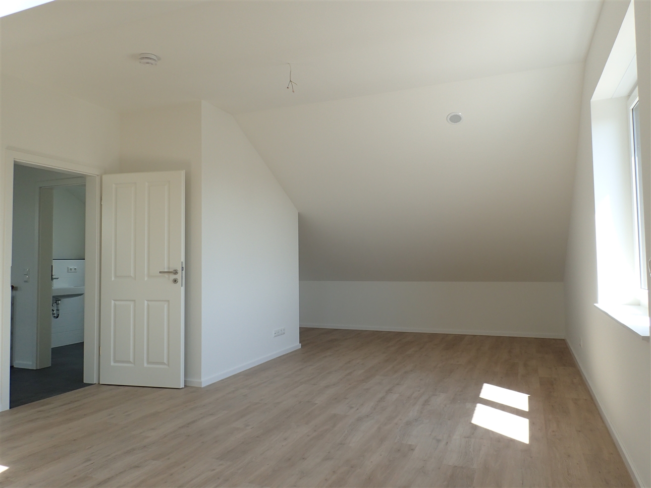 Das Wohnzimmer liegt nach Westen und verfügt über einen vorgelagerten, geräumigen Balkon mit einem Belag aus hochwertigen WPS-Paneelen. Große, bodentiefe Fensterelemente machen den Raum licht und hell. Der Wohnraum im Dach wirkt durch die vorhandenen Dachschrägen gemütlich und erhält Licht durch das Giebelfenster auf der Südseite sowie ein nach Westen gehendes Dachfenster.